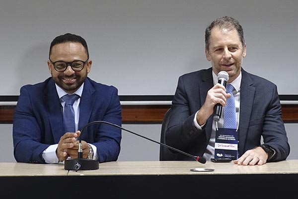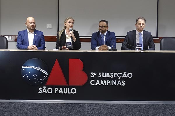 A mesa de abertura do evento teve a participação da Secretária de Desenvolvimento Econômico, Tecnologia e Inovação na Prefeitura de Campinas, Adriana Flosi; do advogado Fernando Pieri, vice-presidente da Comissão Especial de Direito Aduaneiro do Conselho Federal da OAB e presidente da Comissão de Direito Aduaneiro da OAB-MG; do diretor do Ciesp Campinas, José Henrique Toledo Corrêa; e do advogado Alan Murça, presidente da Comissão de Direito Aduaneiro da Subseção de Campinas, organizadora do seminário.